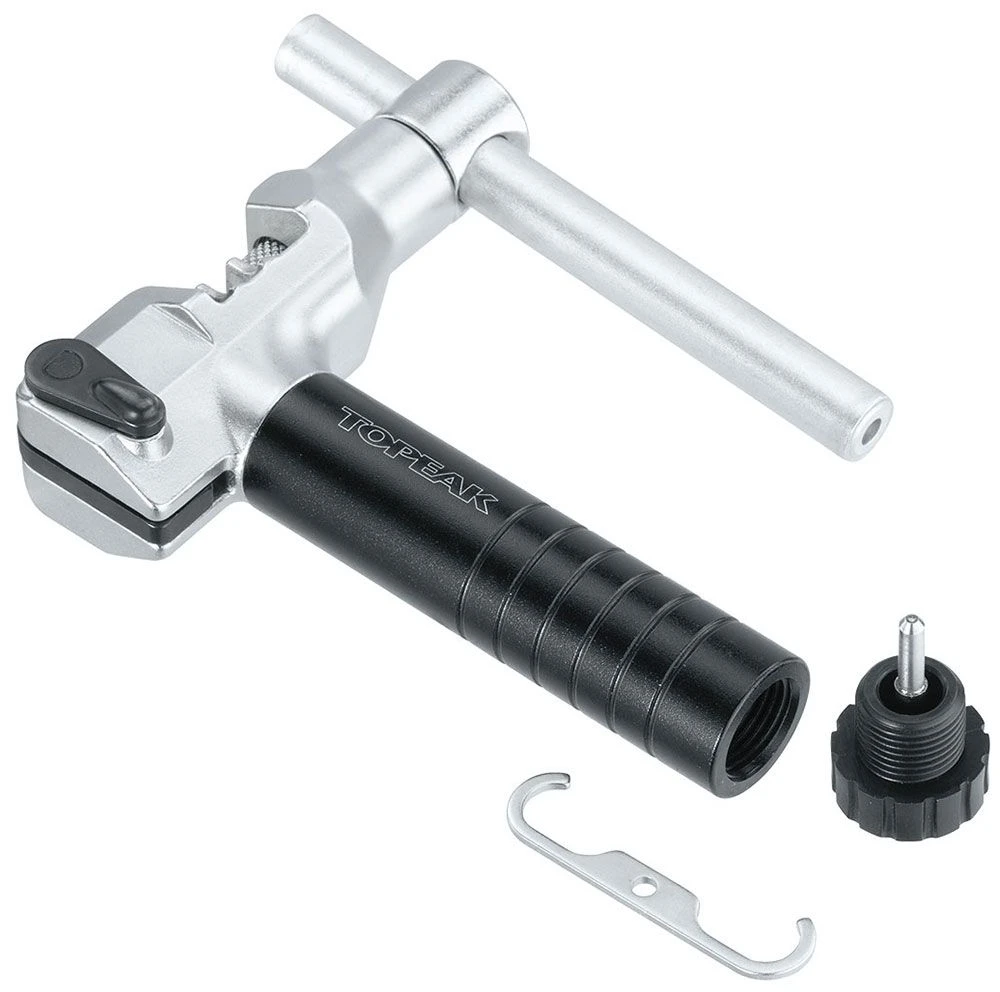 High-quality chain riveter from Topeak with interchangeable rivet pin for single and multi-speed chains up to 12-speed and Campagnolo® 11-speed Hollow Pin chains. The included chain fixing hook keeps the chain in position during riveting. Chain fixing hook and spare rivet pin (included) are stowed in the handle.
