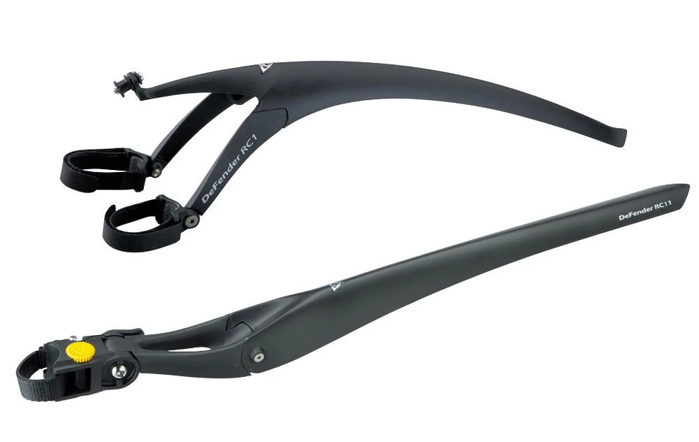 The DeFender™ RC1/RC11 road fender set complements any road race bike. The RC1 front fender has a unique quick release bolt clip and the RC11 rear fender has a simple and secure mount that removes in seconds. The DuaLink angle adjustment allows for optimized fender position providing maximum protection from road spray and grime. The DeFender™ RC1/RC11 set is made of high impact plastic weighing only 39 g/117 g and the highly polished underside prevents dirt buildup. Fits tires up to 700 x 25c.