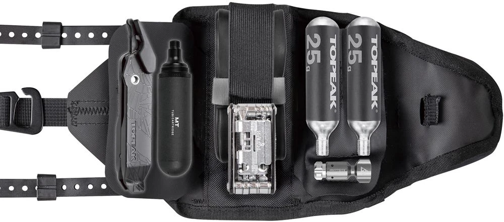 The Gearpack from Topeak is a compact bag with three divided sections with internal organizers that hold things in place to eliminate noise from all your MTB or gravel bike gear. Neatly store tools and tire/tube repair essentials so you’re always prepared for a riding adventure. Secure scratch-free straps provide tool-free mounting anywhere on your bike.