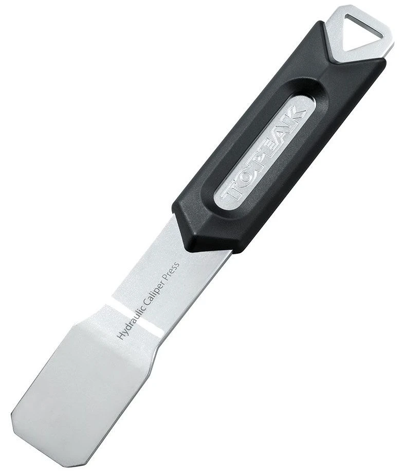 Hardened steel caliper pressing tool to push back pistons when replacing/aligning pads or bleeding hydraulic brake systems.