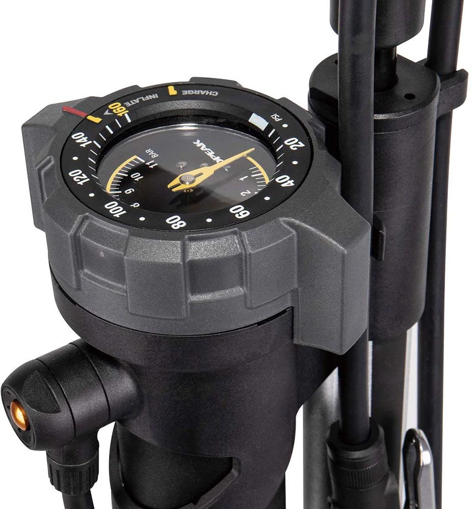 This pump has an integrated aluminum air chamber that stores an air charge of one liter, up to 160psi / 11 bar, to quickly fill your tire and ensure the proper installation on a tubeless rim, just like a shop compressor. Once you flip the selector from “CHARGE” to “INFLATE” mode, air bypasses the chamber and flows directly into your tire like a standard pump.
