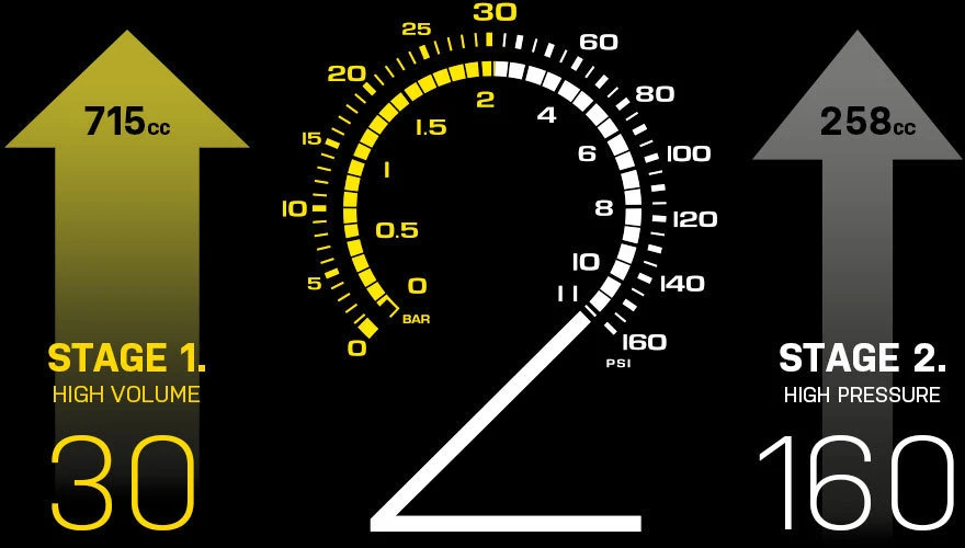 – Volume Per Stroke: 715cc (Stage 1), 258cc (Stage 2)