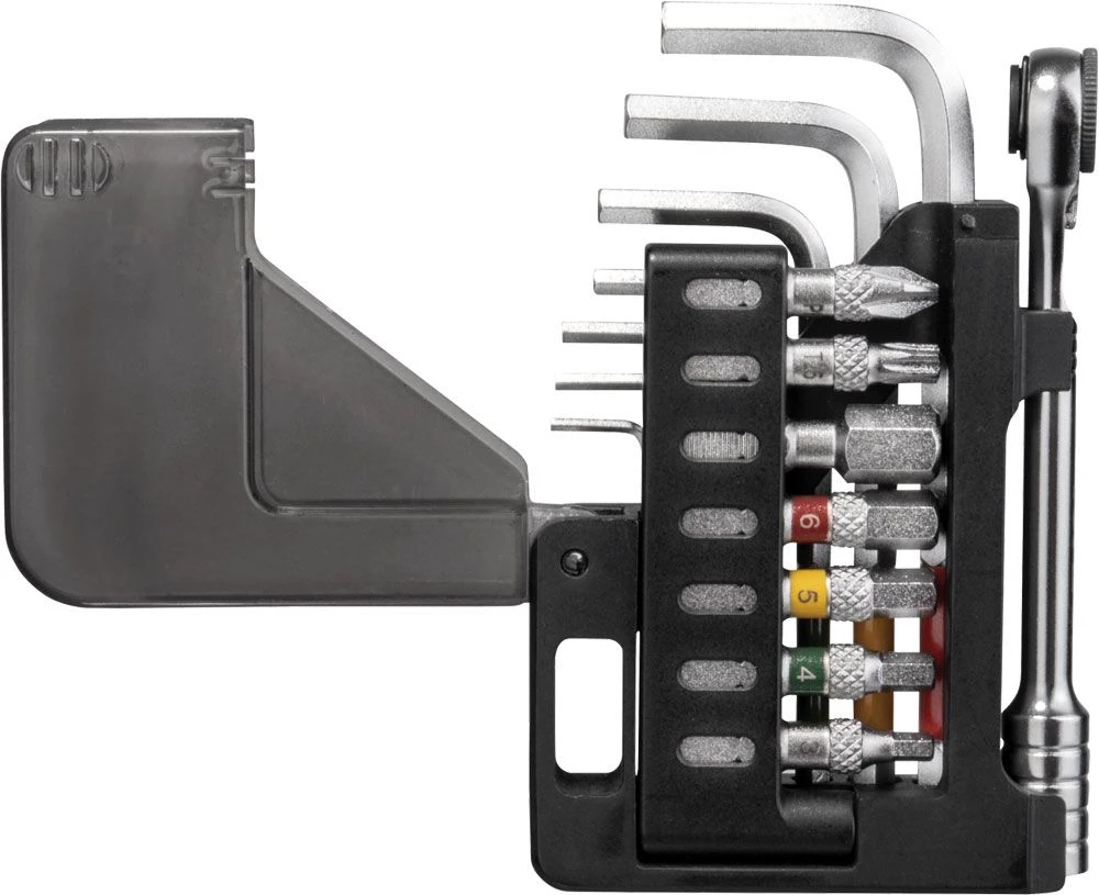 The Topeak Omni Toolcard is an incredibly compact ratchet set with 15 functions and hexagonal wrench set with ball heads. This and seven tool bits are housed in an innovative case in credit card format, which can be conveniently stowed in jersey and saddle bags due to its compact dimensions.