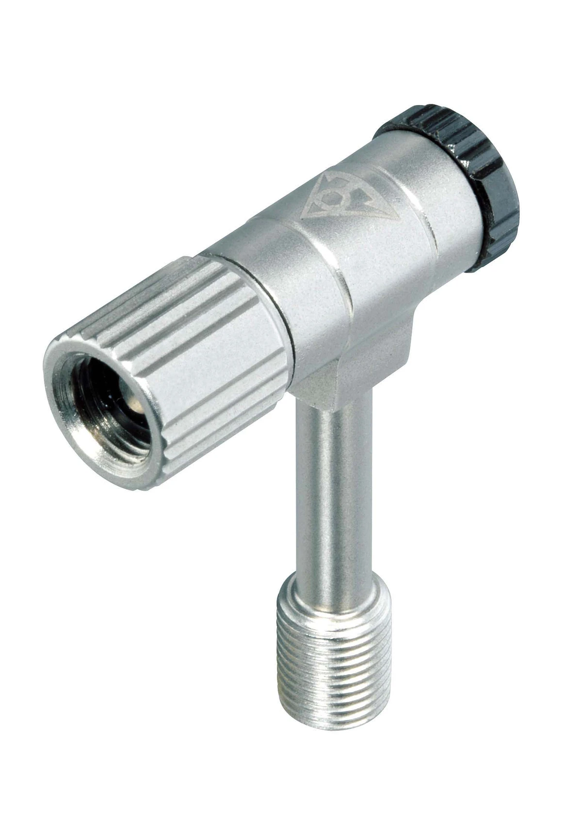 A Schrader valve adapter allows using the JoeBlow Ace floor pump for quickly pumping forks and rear shocks. Built-in air release knob allows fine tuning air pressure.