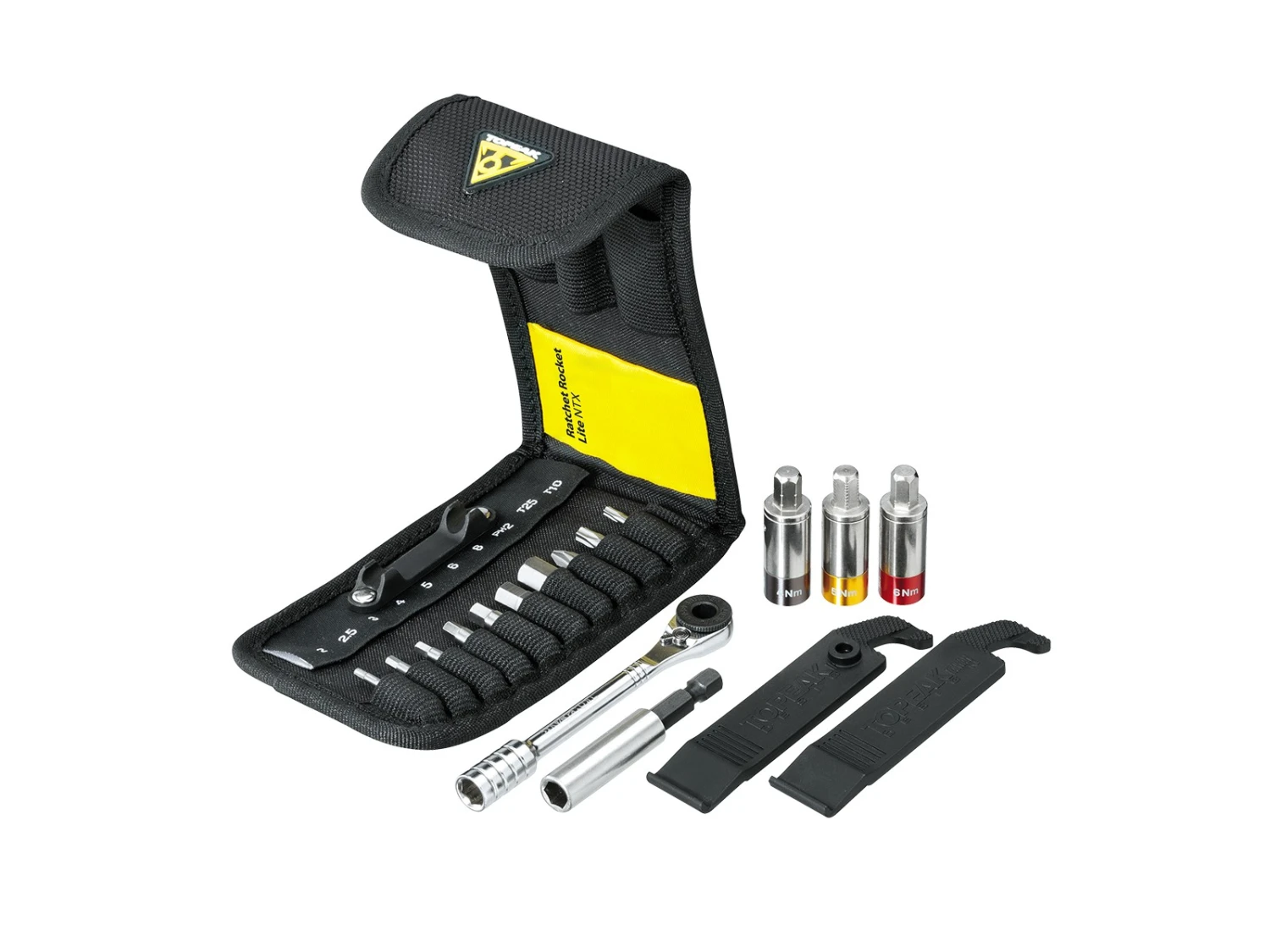 The only thing missing is the kitchen sink! The Topeak Ratchet Rocket Lite NTX has everything you need to fix and make precise adjustments to your bike while on the road. Featuring a fine tooth ratchet mechanism with reverse lever and thumb wheel with Nano TorqBits for ease and torque accuracy in tight spots. Includes magnetic bit holder, hardened steel tools in 2, 2.5, 3, 4, 5, 6 and 8mm hex, T10, T25 Torx, #2 Phillips bits and two engineering grade plastic tire levers. The protective case keeps things organized and secure, and even has a pocket to carry glueless patches.