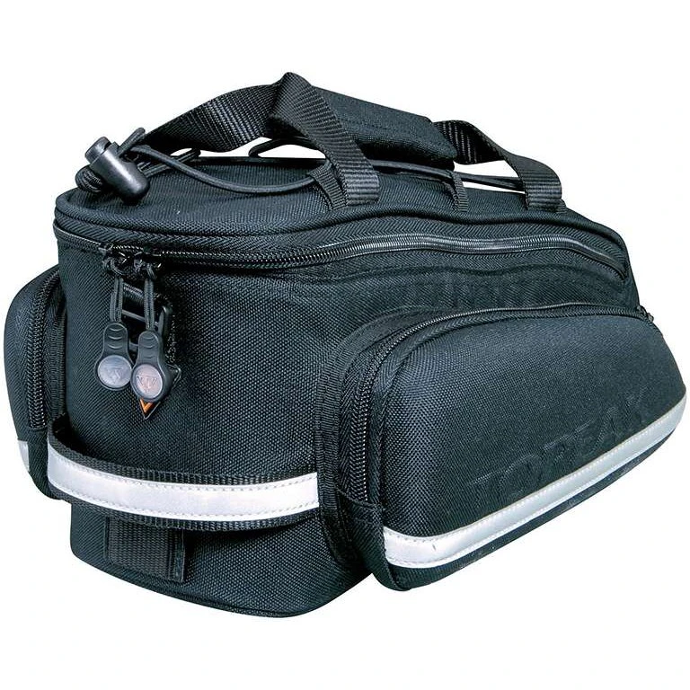 Compact bag, perfect for commuting, school and errands. Rigid foam insulates and holds shape. Main compartment plus two zippered side bags. Aero Shape for road and fitness bikes.