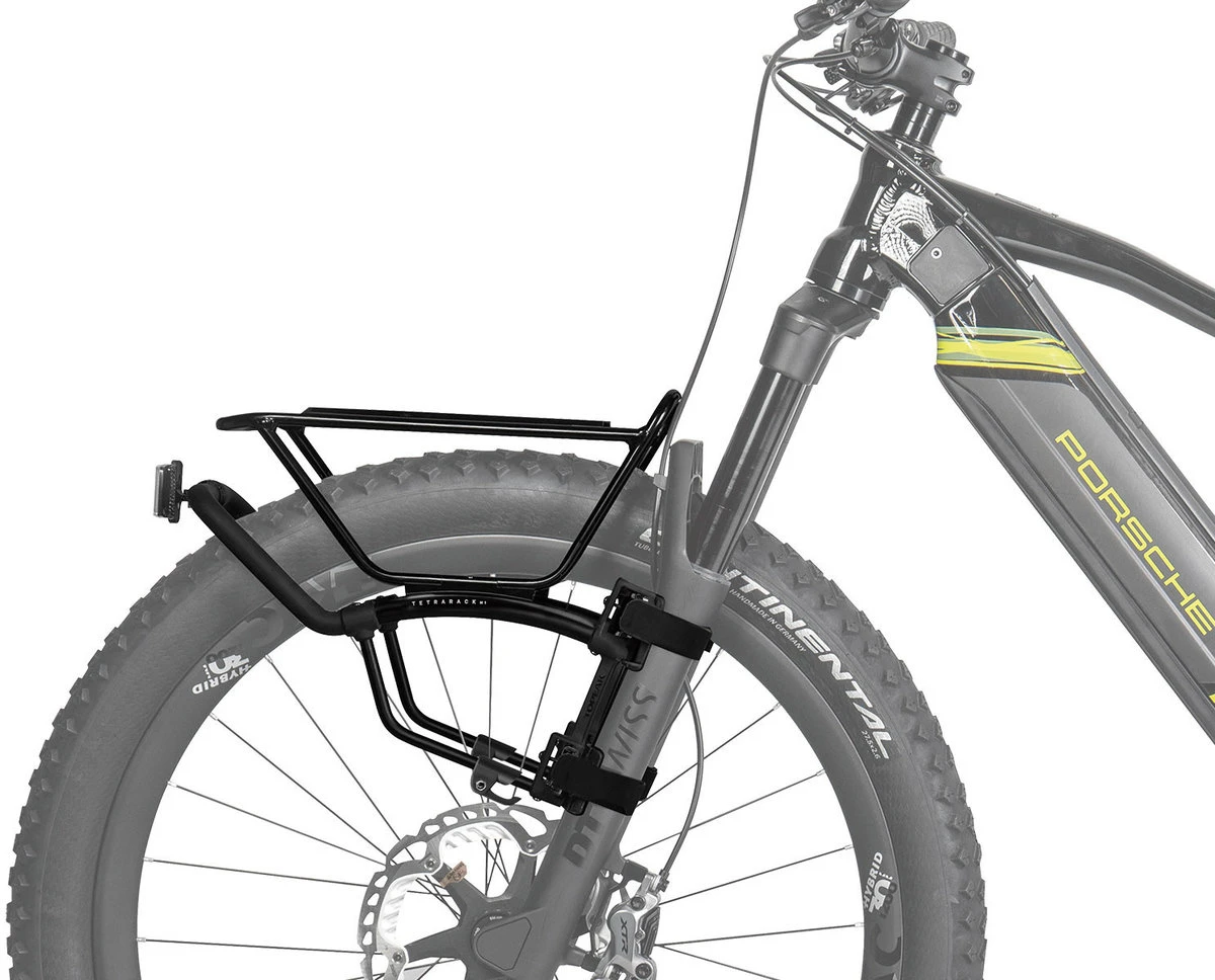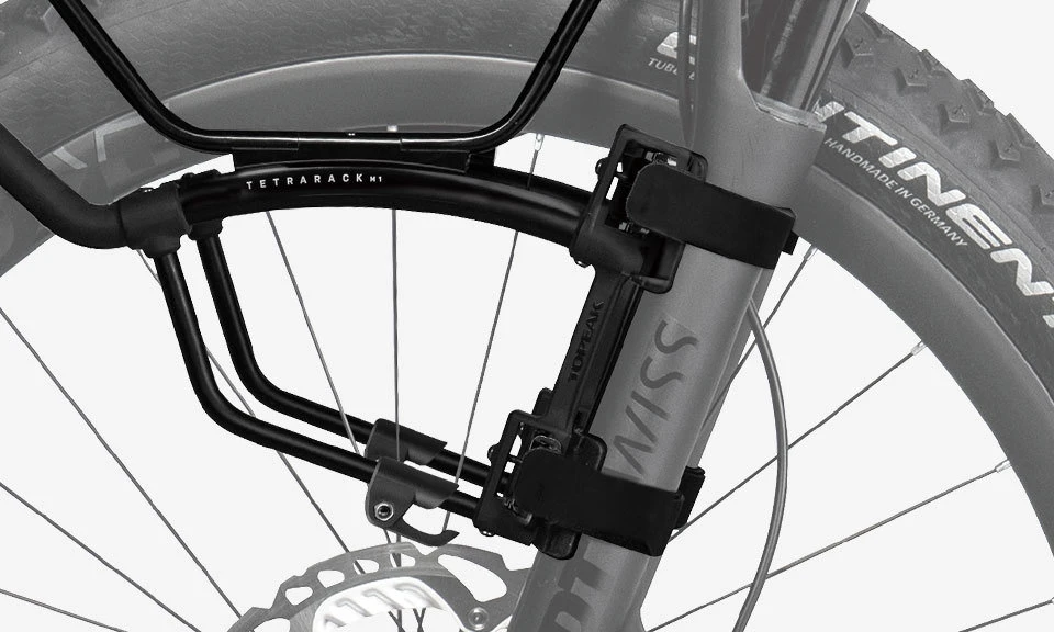 The perfect quick-mount front rack system for MTB suspension forks or rigid forks without rack eyelets. This one-size-fits-all front rack features an innovative top plate that adjusts to levels independently from the fork angle. Integrated QuickTrack system allows Topeak TrunkBags to slide and lock into place and release with a the push of a button. Innovative hook-and-loop-strap mounting system cinches down tight to keep the load stable and allows mounting on a wide range of bikes. Also compatible with KLICKfix / RackTime Snapit or Vario system bags.
