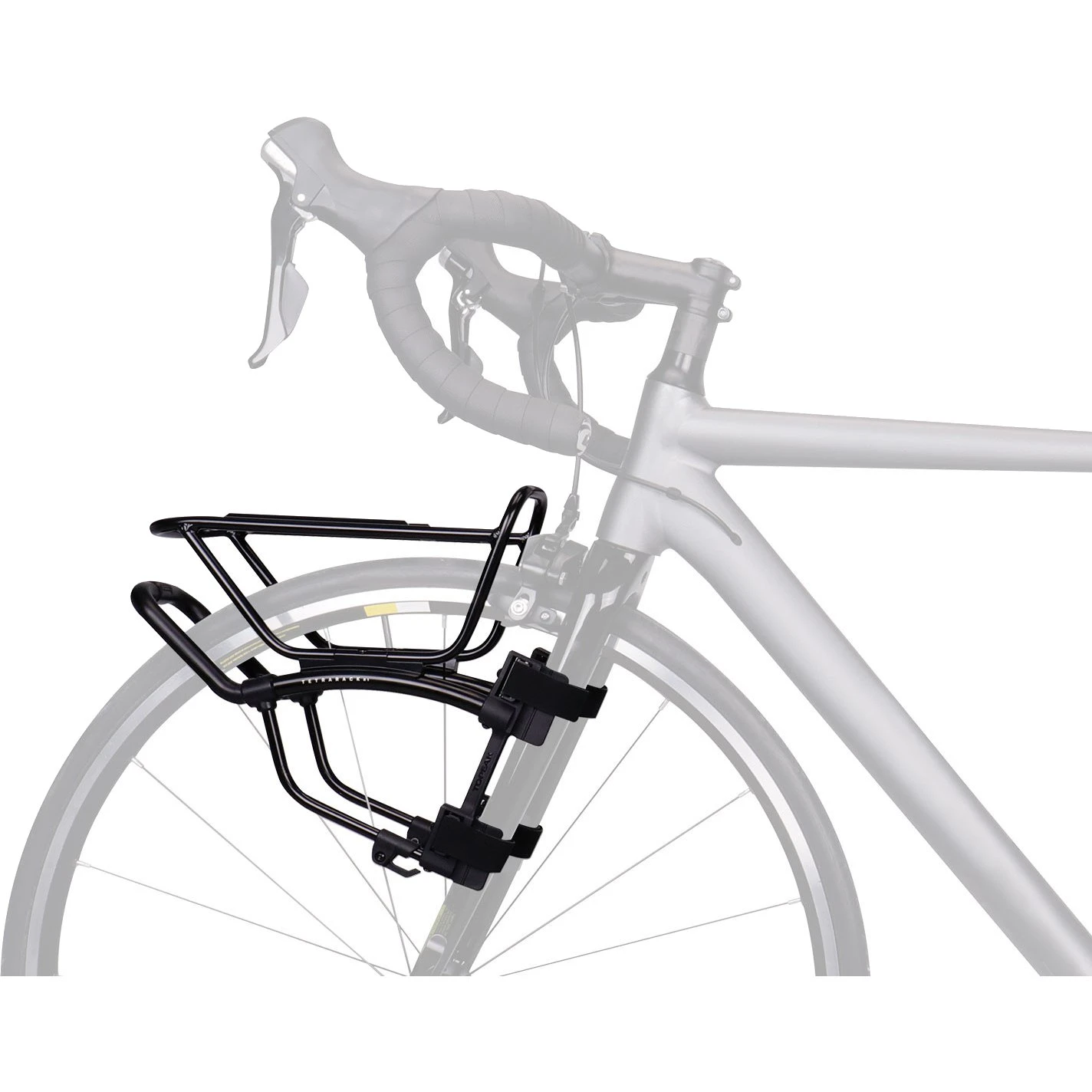 The perfect quick-mount front rack system for road, cross, hybrid or touring bikes with rigid forks. This one-size-fits-all front rack features an innovative top plate that adjusts to level independent the fork angle. Integrated QuickTrackâ„¢ system allows Topeak TrunkBags to slide and lock into place and release with a the push of a button. Innovative hook and loop strap mounting system cinches down tight to keep the load stable and allow mounting on a wide range of bikes.